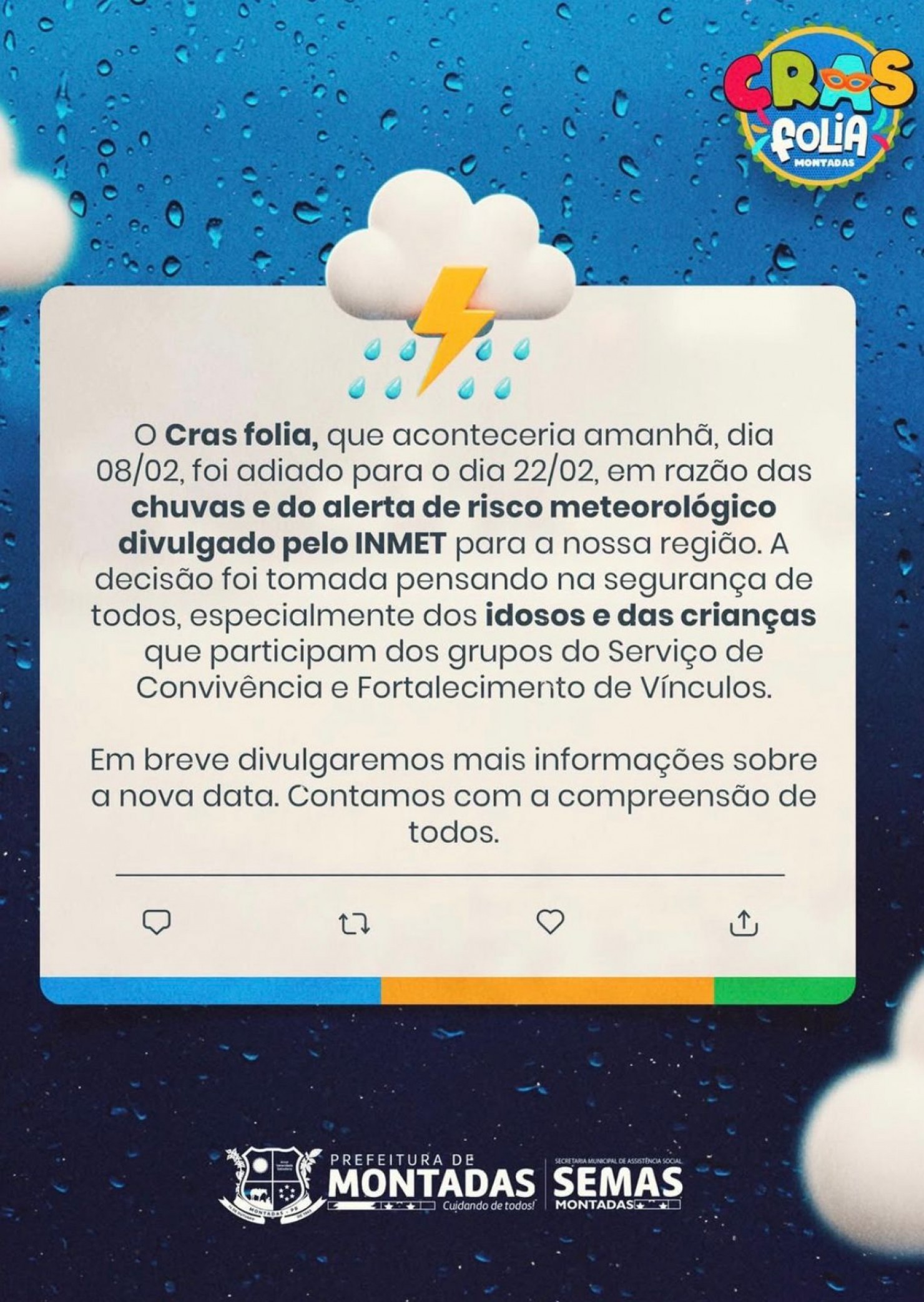 A Prefeitura de Montadas, através da Secretaria de Assistência Social, comunica a toda a população que a festividade CRAS Folia foi oficialmente adiada para o dia 22/02.