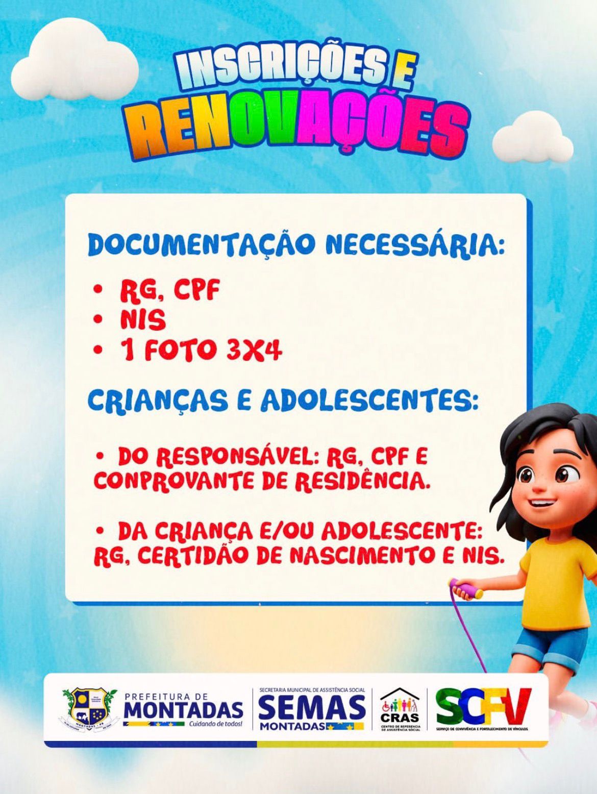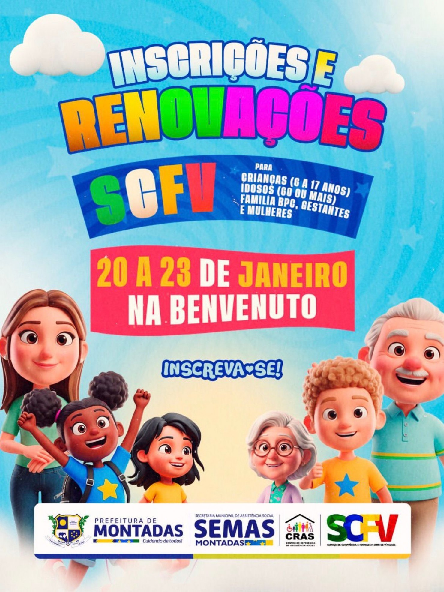 A Prefeitura de Montadas, por meio da Secretaria Municipal de Assistência Social, informa que estão abertas as inscrições e renovações para o SCFV. O serviço é um pilar da nossa rede de proteção, promovendo a inclusão social e o bem-estar de diversas gerações montadenses.