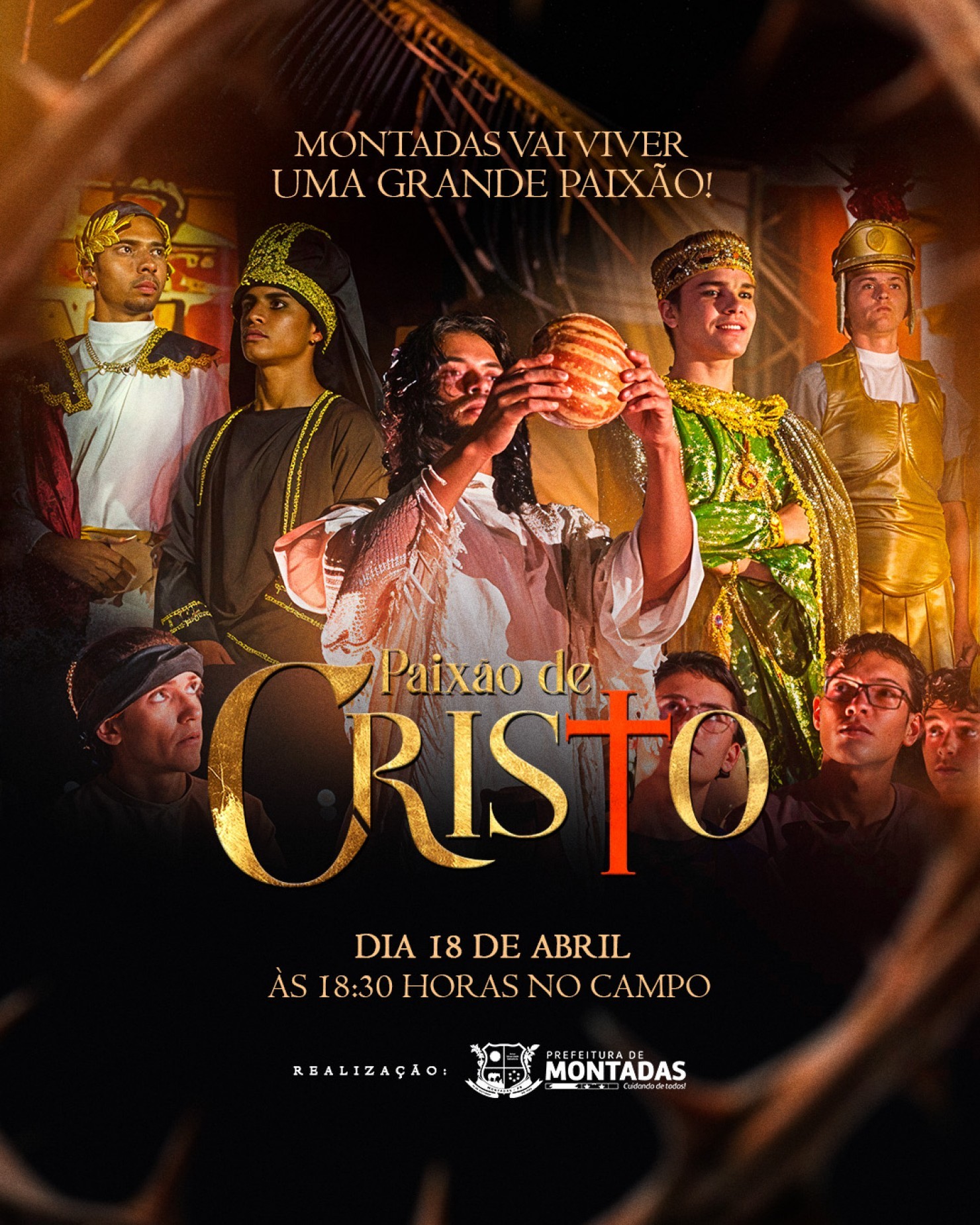 A Prefeitura Municipal de Montadas convida toda a população para um momento de fé, emoção e cultura: a Encenação da Paixão de Cristo, que será realizada no dia 18 de abril, a partir das 18h30, no Campo.