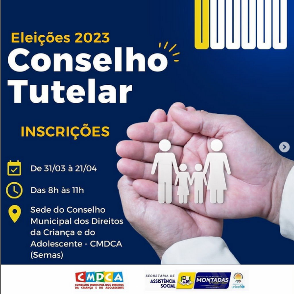 O Conselho Municipal dos Direitos da Criança e do Adolescente (CMDCA) e a Prefeitura Municipal de Montadas, através da Secretaria Municipal de Assistência Social, lançaram o Edital para a Eleição 2023 do Conselho Tutelar e abriram as inscrições, que seguem até o dia 21 de abril de 2023.