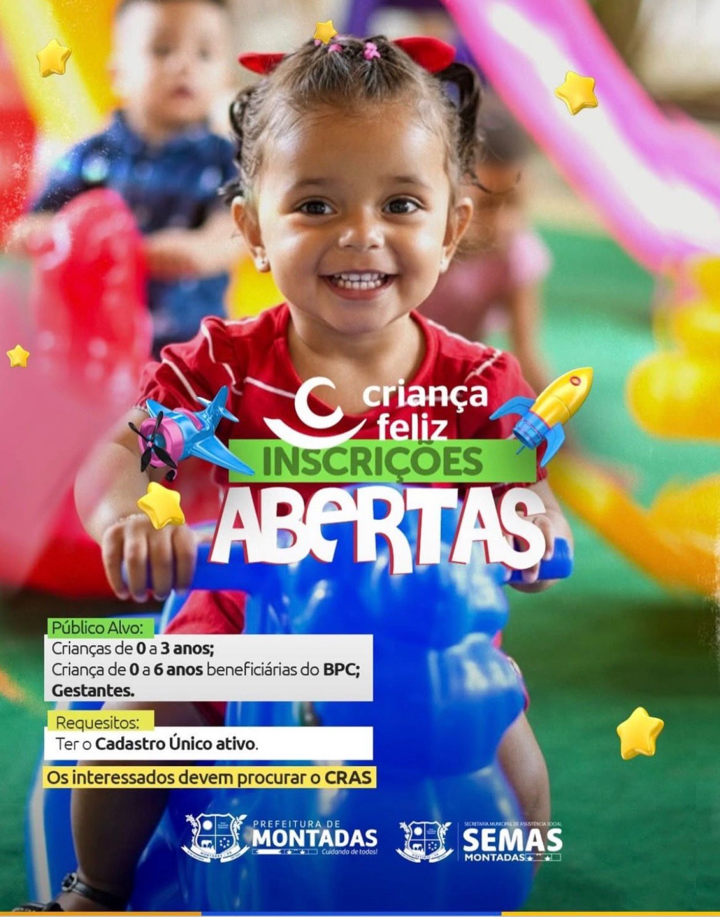 A Prefeitura de Montadas, comprometida com o futuro das nossas crianças, informa que estão abertas as inscrições para o Programa Criança Feliz. A iniciativa é focada no acompanhamento integral e no fortalecimento do desenvolvimento infantil nos primeiros anos de vida, oferecendo suporte e orientação às famílias.