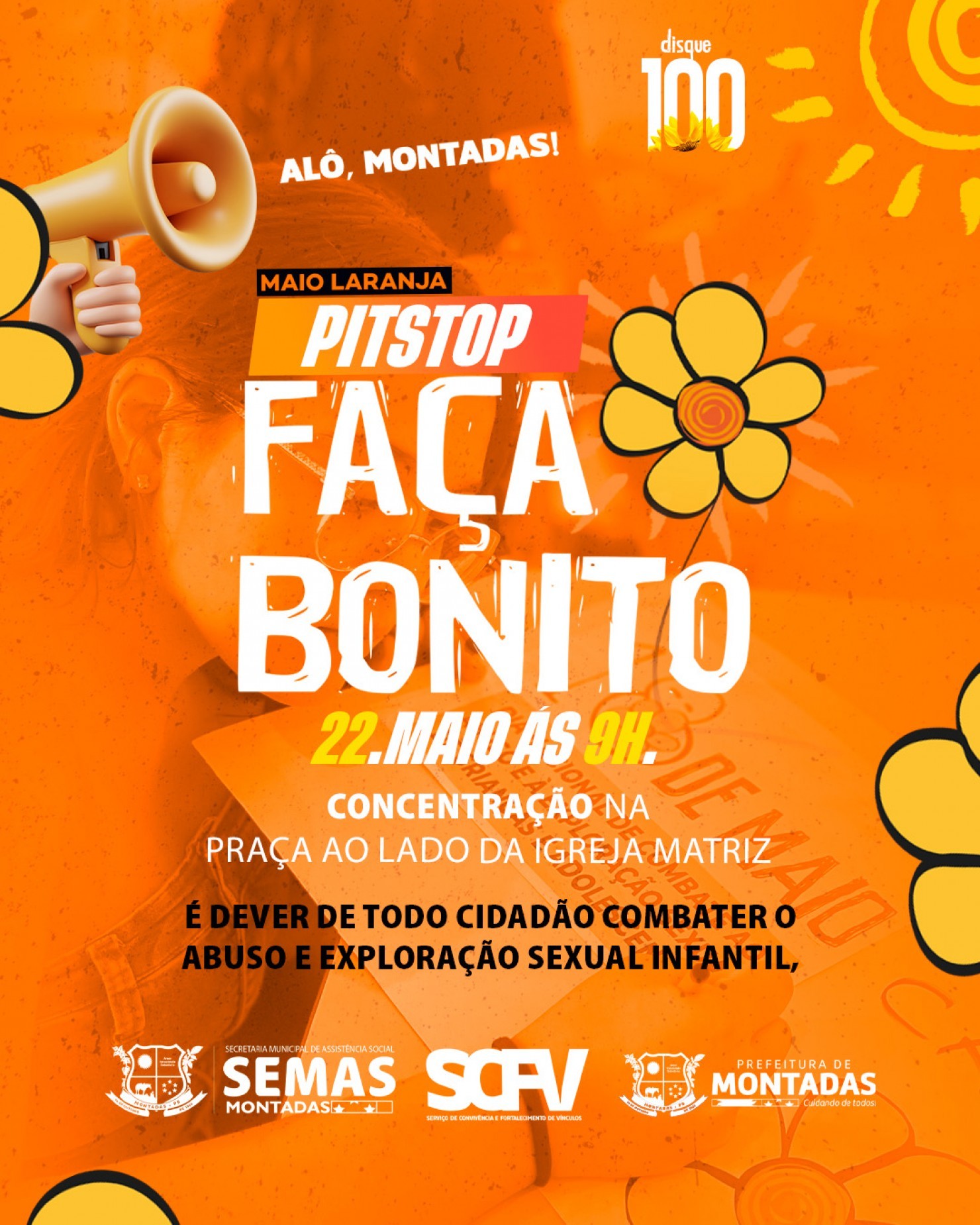 A Prefeitura Municipal de Montadas, por meio da Secretaria de Assistência Social e do Conselho Tutelar, convida toda a população para participar do Pitstop “Faça Bonito”, que será realizado no próximo dia 22 de maio, às 9h, com concentração na praça ao lado da Igreja Matriz.