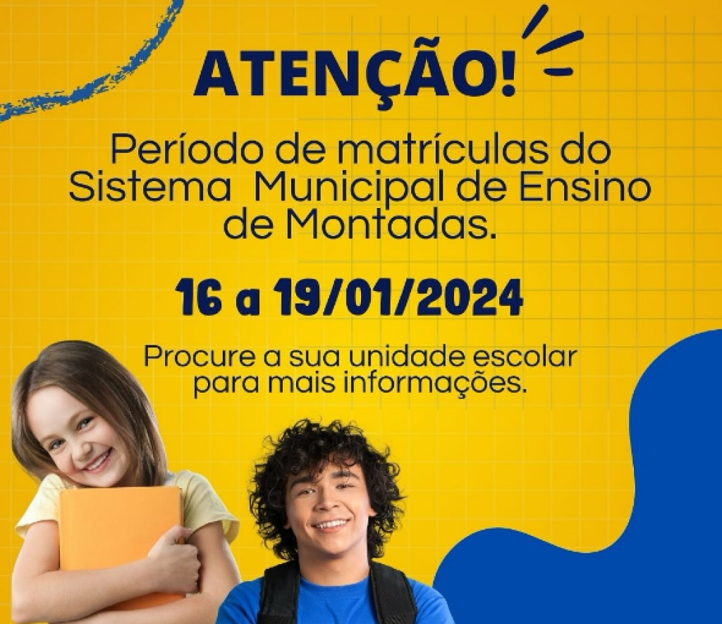 A Secretaria Municipal de Educação de Montadas divulga o calendário das matrículas da rede de ensino municipal, iniciam dia 16 e seguem até 19 de janeiro.